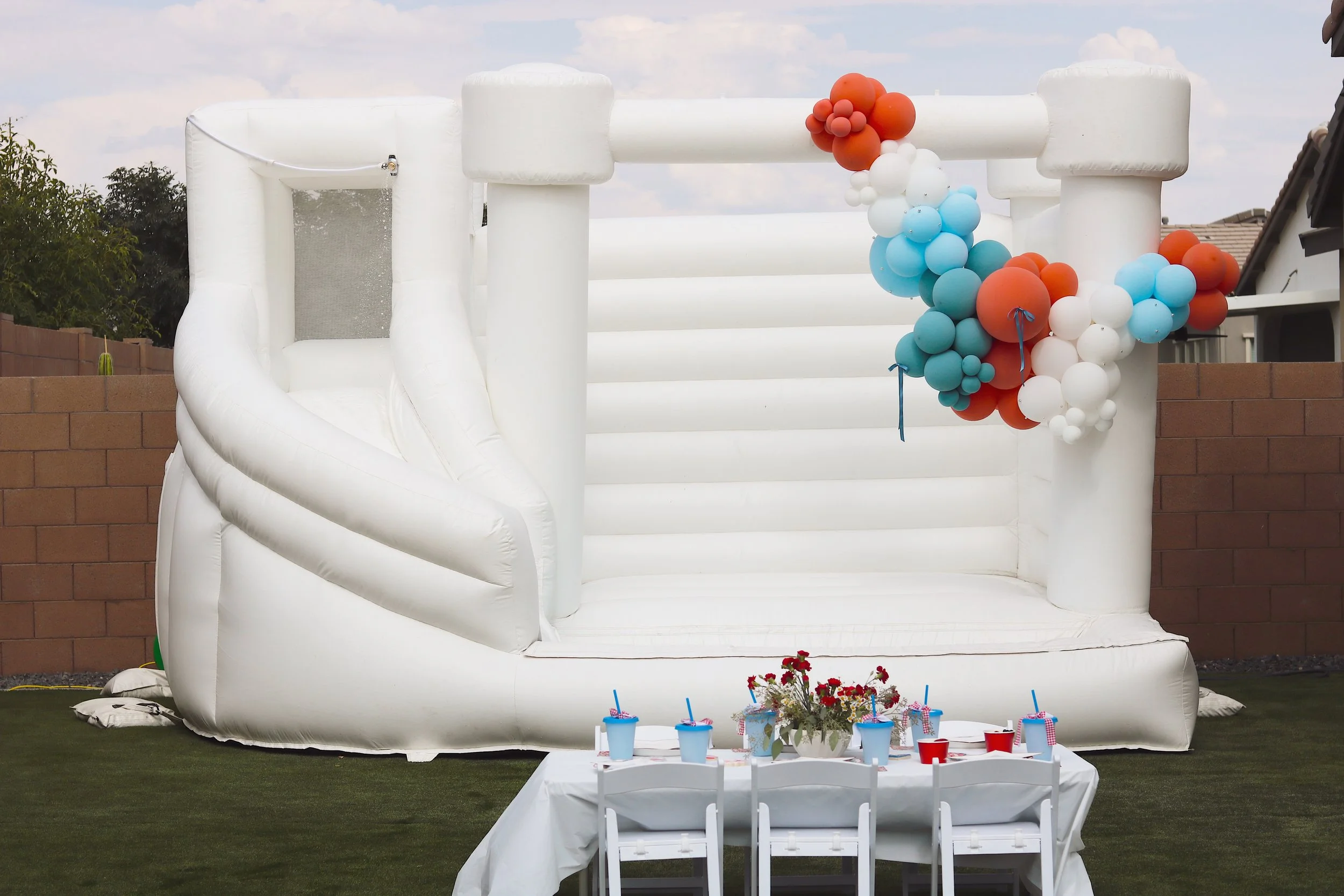 Tucson’s modern white bounce house + waterslide combo is here and ready to make a splash at your summer party! This inflatable combo has plenty of bouncing space, a curved slide, and an 8’ x 4’ pool.